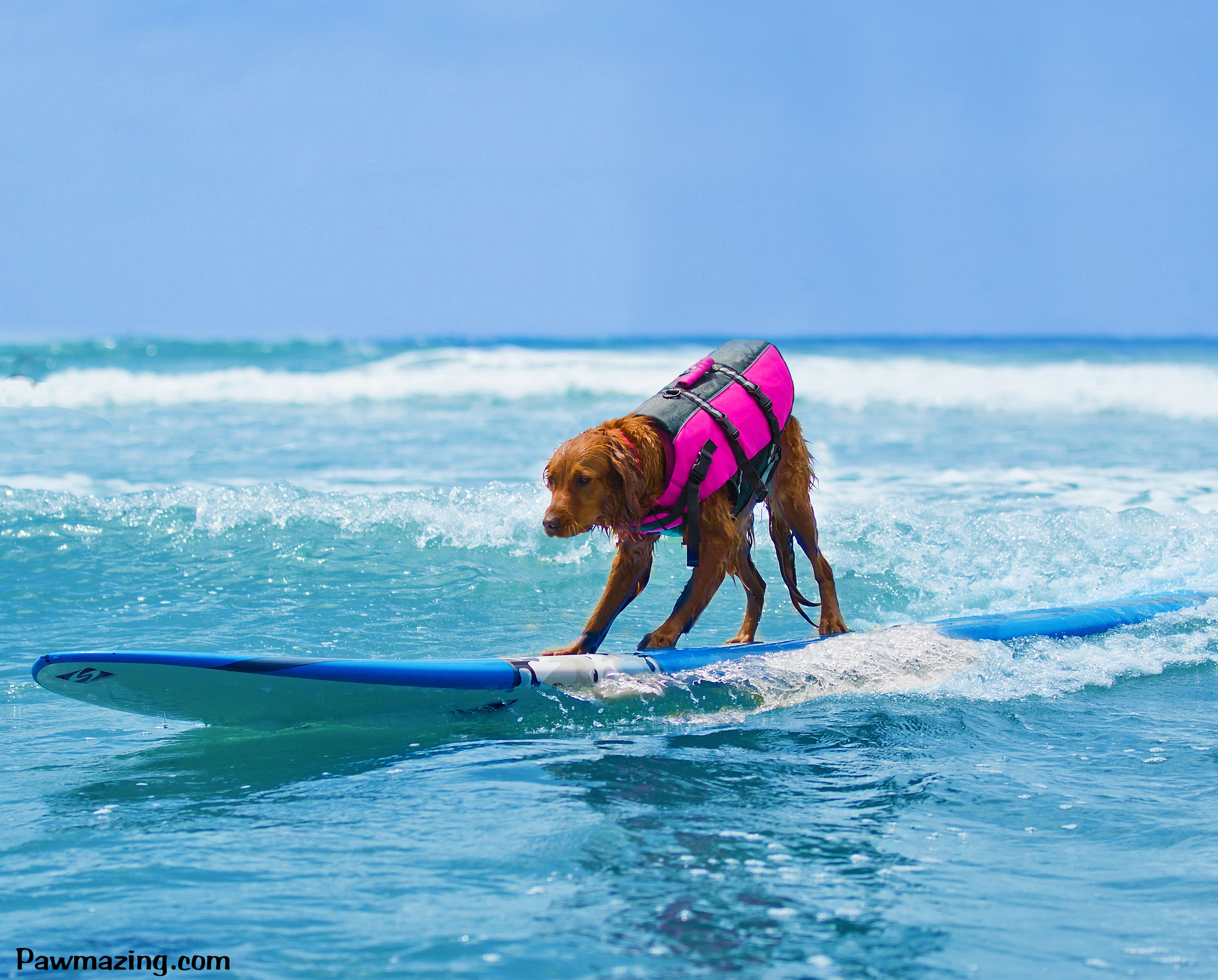 Judy: Dogs who do well at surfing are those who are focused and not distracted by everything else that is going on around them. Dogs who can re-position their weight to keep from wiping out have an upper paw too. A lower center of gravity really helps too, so dogs like bulldogs do really well. Larger dogs often position themselves into a play bow type stance to lower the center of gravity instinctively.